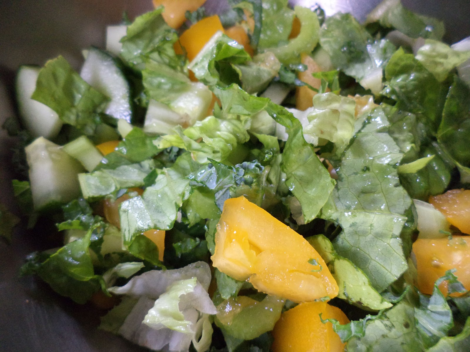 Spis en stor salat til middag og lunsj. Bruk en dressing bestående av sitron, kaldpresset oliven-, linfrø- eller hampfrøolje, hvitløk, tahini/mandelsmør, Krystall- eller sjøsalt, cayennepepper og stevia.
